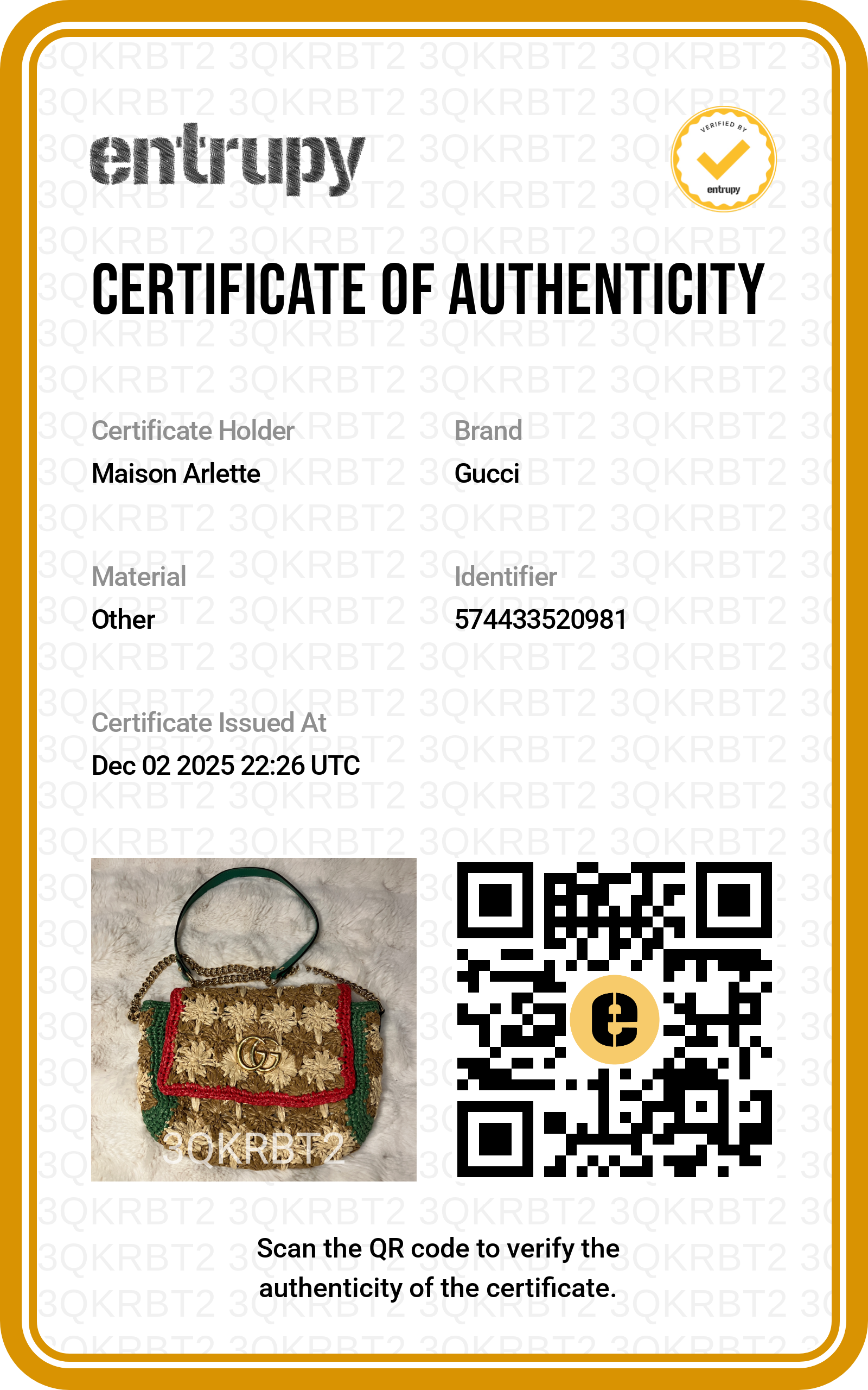 • Certificat d’authenticité Entrupy (valeur 50€)
